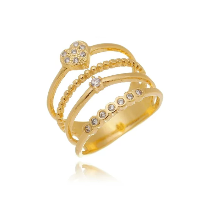 Anel com 4 fileiras, sendo a primeira fileira com um coração cravejado ao centro, a segunda fileira com bolinhas, a terceira fileira com uma mini zirconia e a quarta fileira com 7 zirconias.