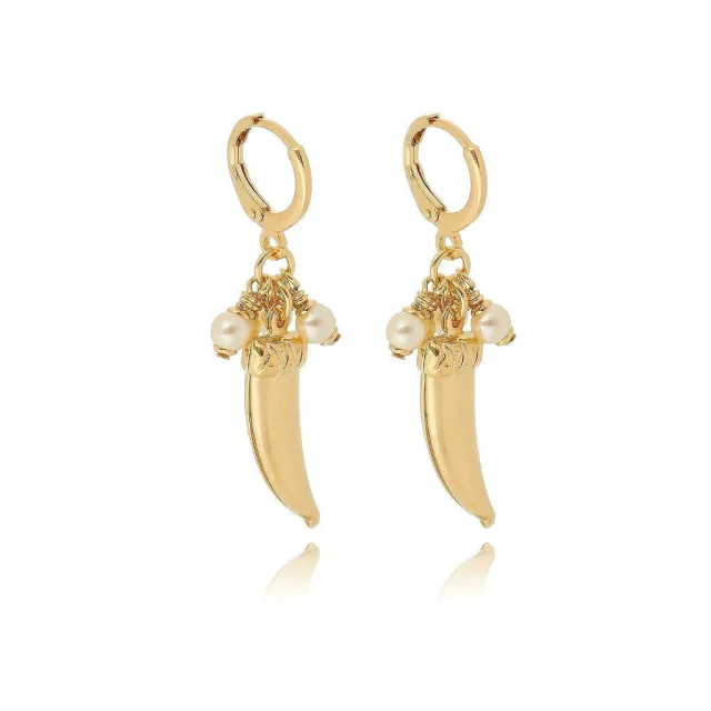 Brinco click articulado com pingente dente de elefante e 4 pérolas pequenas penduradas.