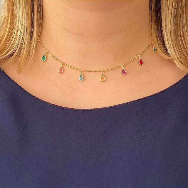 Colar choker corrente de bolinhas com gotas coloridas penduradas.