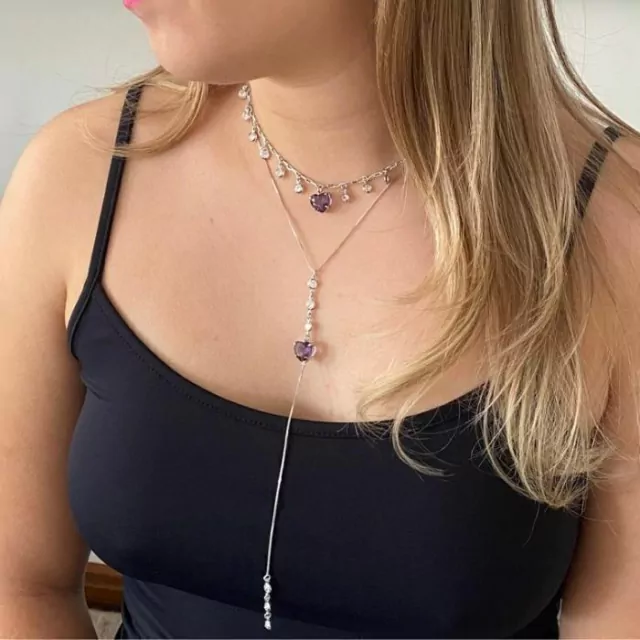 Colar duplo, sendo a 1° corrente chocker de elos retangulares com 12 zircônias penduradas e pingente com 1 coração de pedra fusion ametista, a 2° corrente veneziana com 3 zircônias e 1 coração de pedra fuison ametista, com 1 fio e 3 zircônias na ponta.