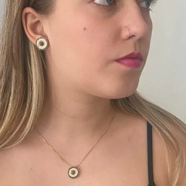 Colar mandala pequena cravejado de zirconias pretas ao redor, no meio zirconias cristal e ao centro zirconias pretas.