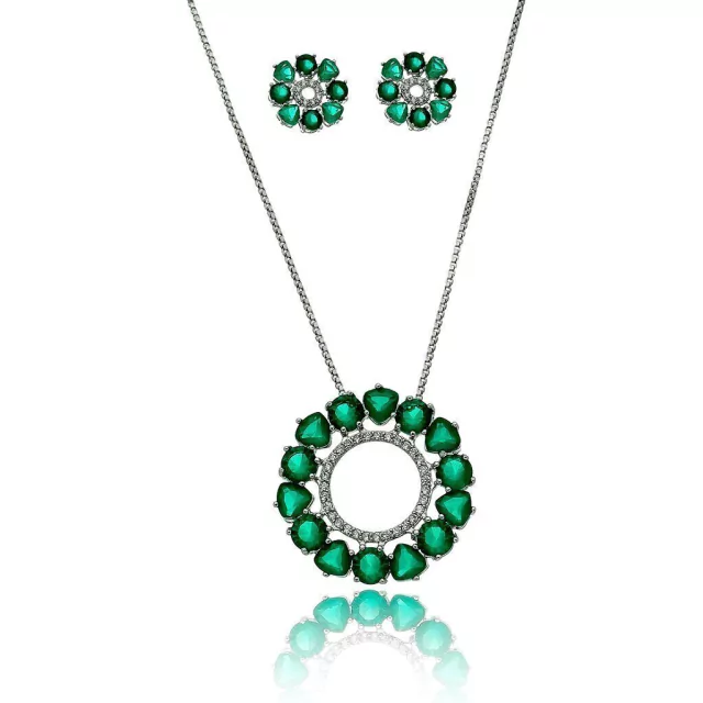 Conjunto colar e brinco mandalada em formato de flor, vazado com zirconias ovais verdes ao redor e micro zirconias cristais cravejadas ao centro.