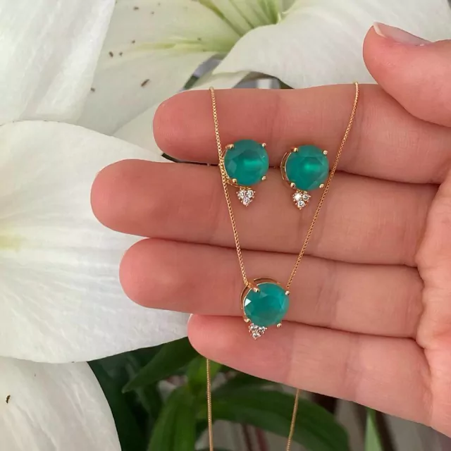 Conjunto colar corrente veneziana e brinco com pedra azul aqua e 3 micro zirconias na ponta.